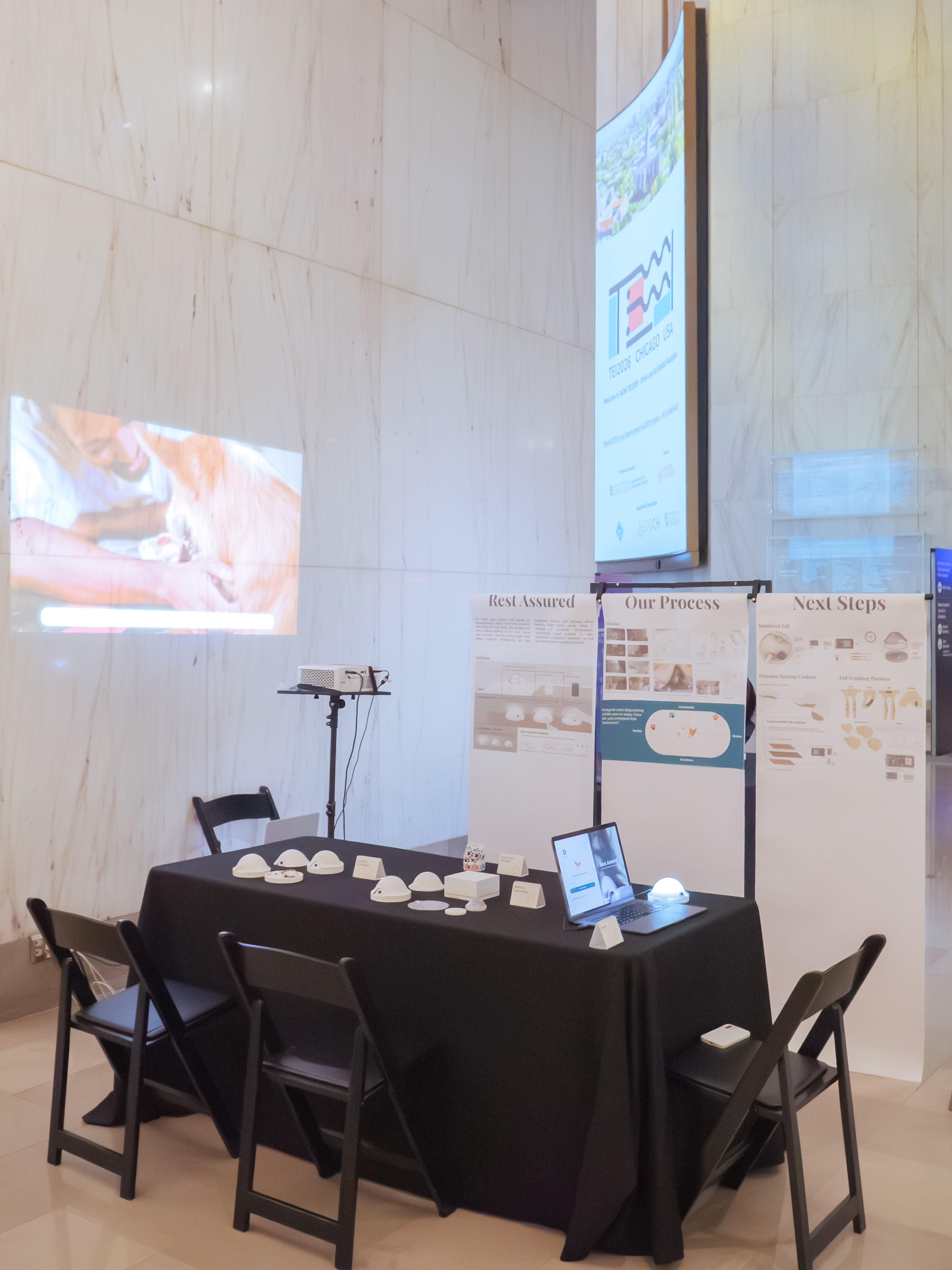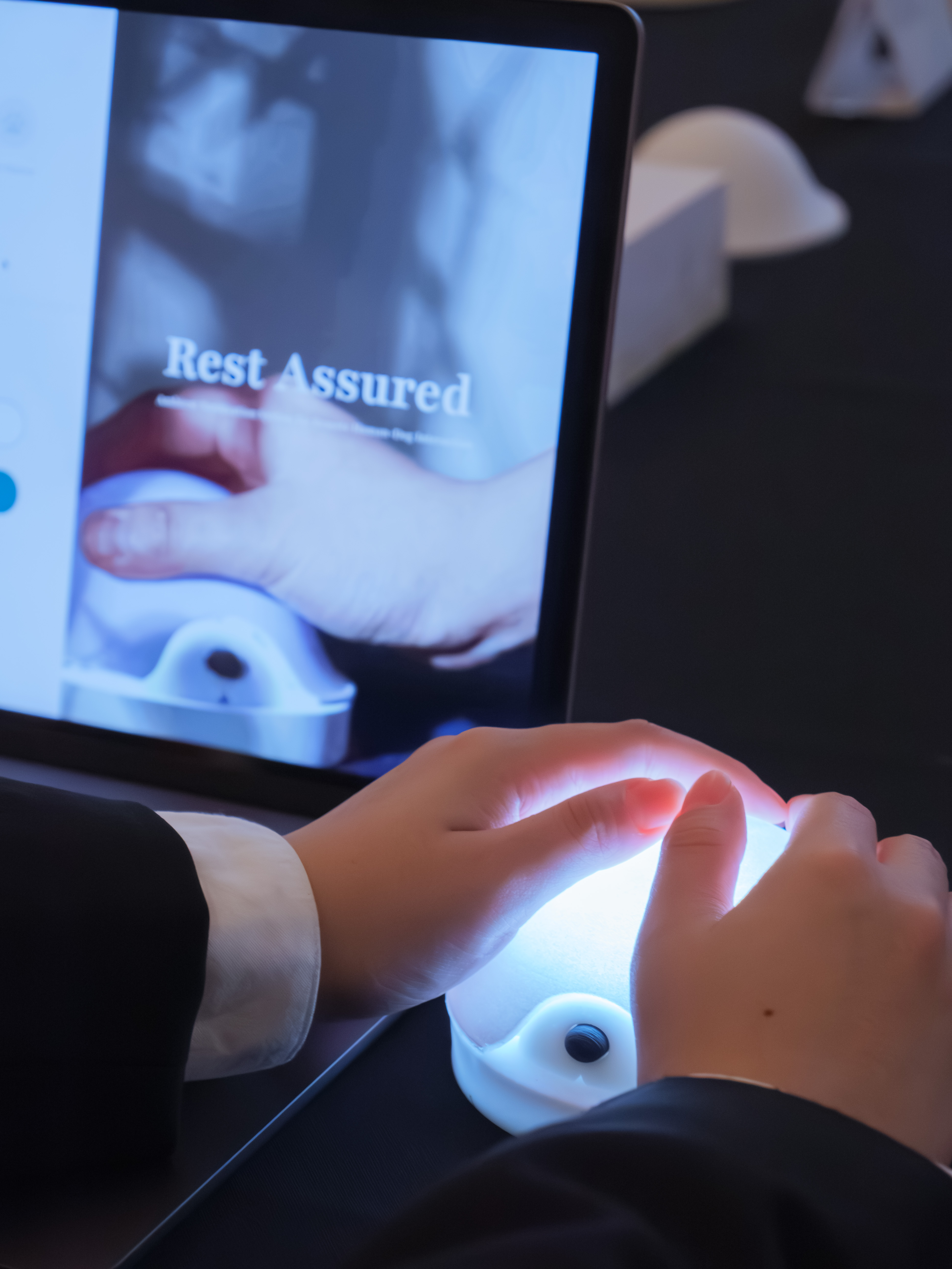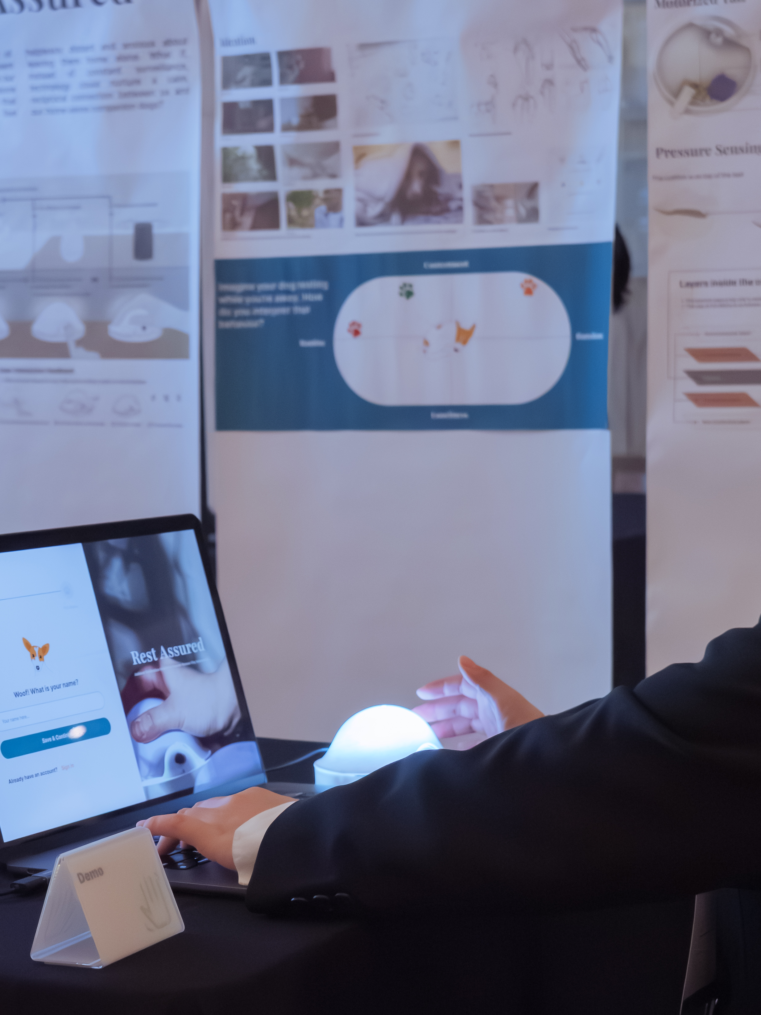 What if, instead of constant surveillance, technology could nurture a calm, reciprocal connection between us and our furry babies? Rest Assured is an IoT ambient notification system for pet dog owners to feel confident and less anxious about leaving their dogs home alone. Consisting of a smart device inspired by a resting dog hidden under a blanket, a hand-sewn tail-tracking harness, and a pressure-sensitive cushion, the system achieves the intended user goals by strengthening their emotional bond and encouraging the dog to rest longer within a closed feedback loop.