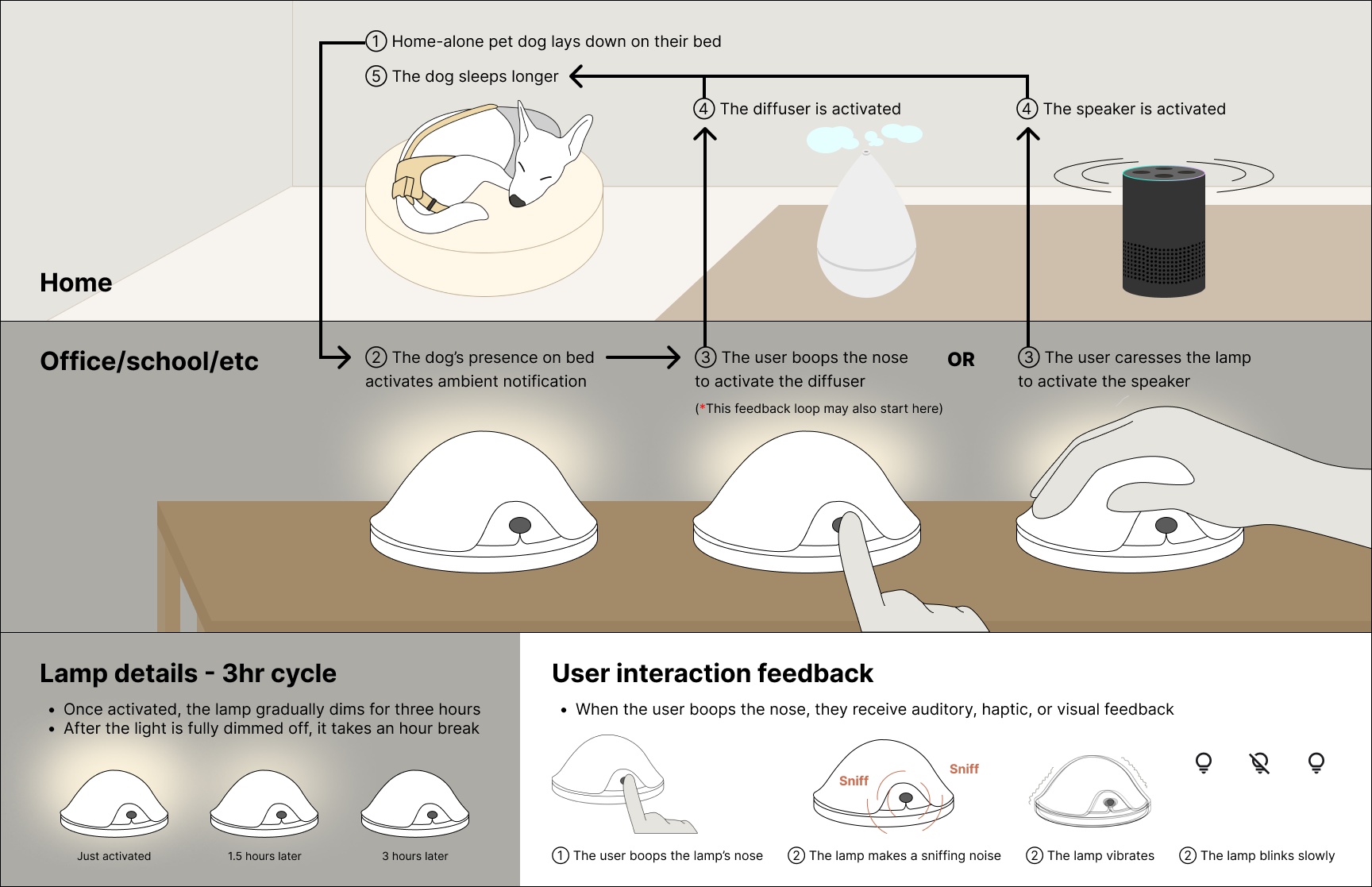 Rather than being limited by the form factor of a dog-like appliance, we started by brainstorming intuitive interactions users might have with the device.