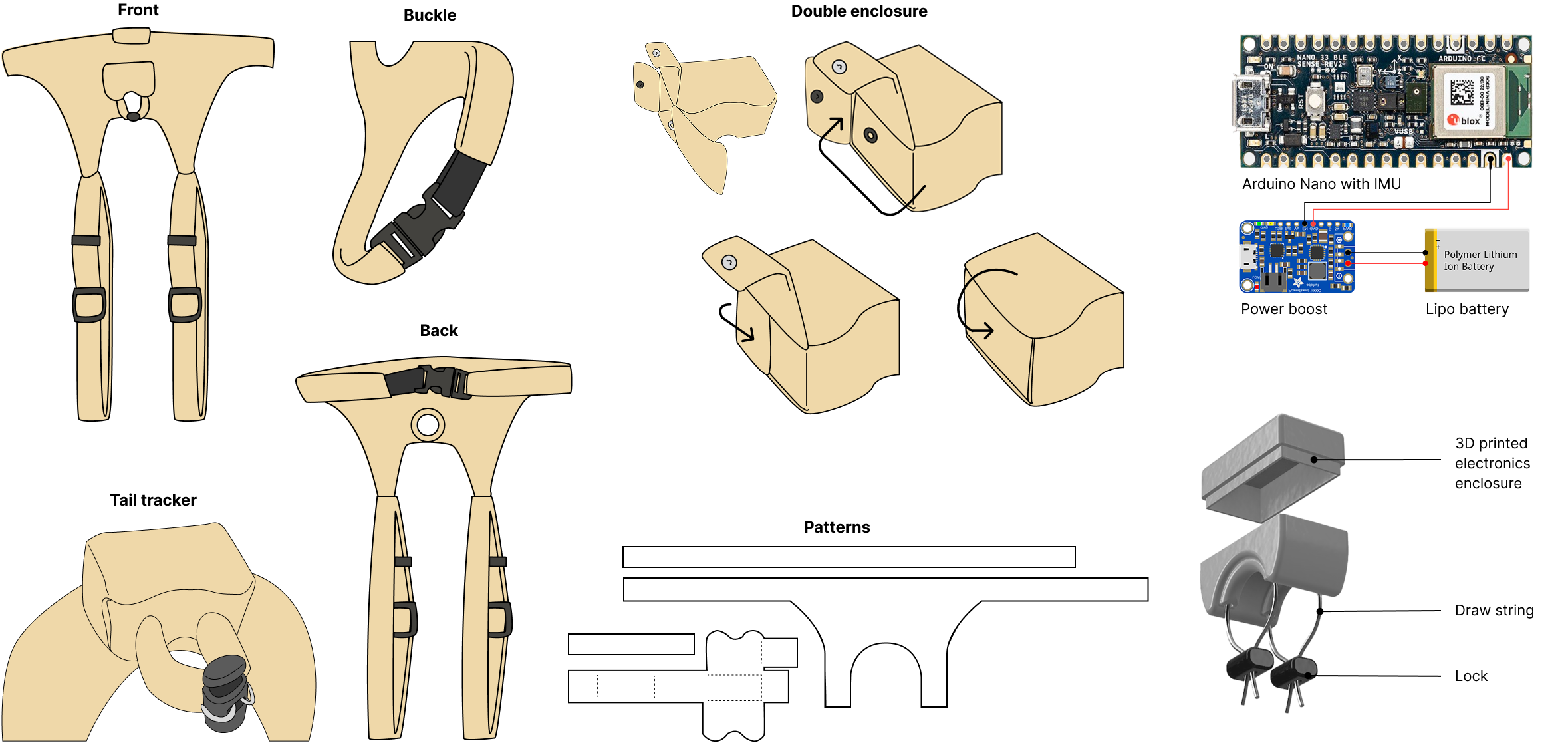 To minimize desensitization training for dogs and their owners and address safety concerns, we decided on a doggy pants form factor, borrowing from commercially available dog diapers and pants.